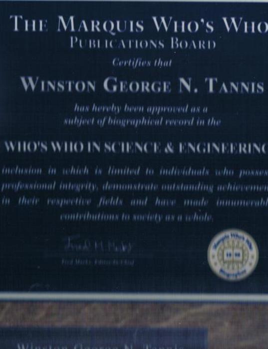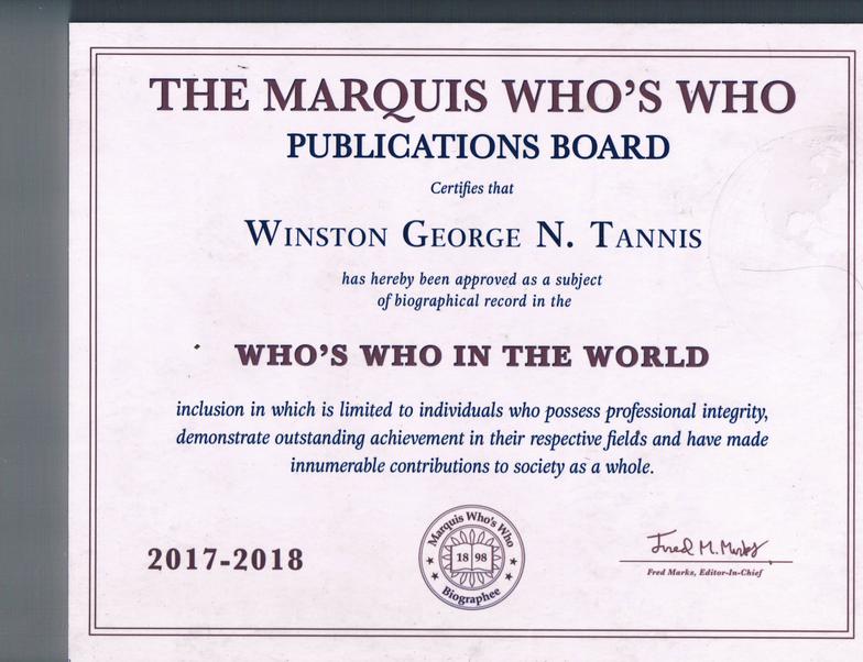 The Albert Nelson Marquis Lifetime Achievement Award in favor of WG was announced in 2017 - the same year during which Winston George Tannis was included in the Who's Who of The World, the American Who's Who, and the Who's Who of Science and Engineering. His genius was thus again recognized as truly unique, and placing him uniquely in the annals of history as well as within the current narratives, dialogues, great thoughts, diplomatic interventions, pedagogic missions and artistic activities of this new millennium.